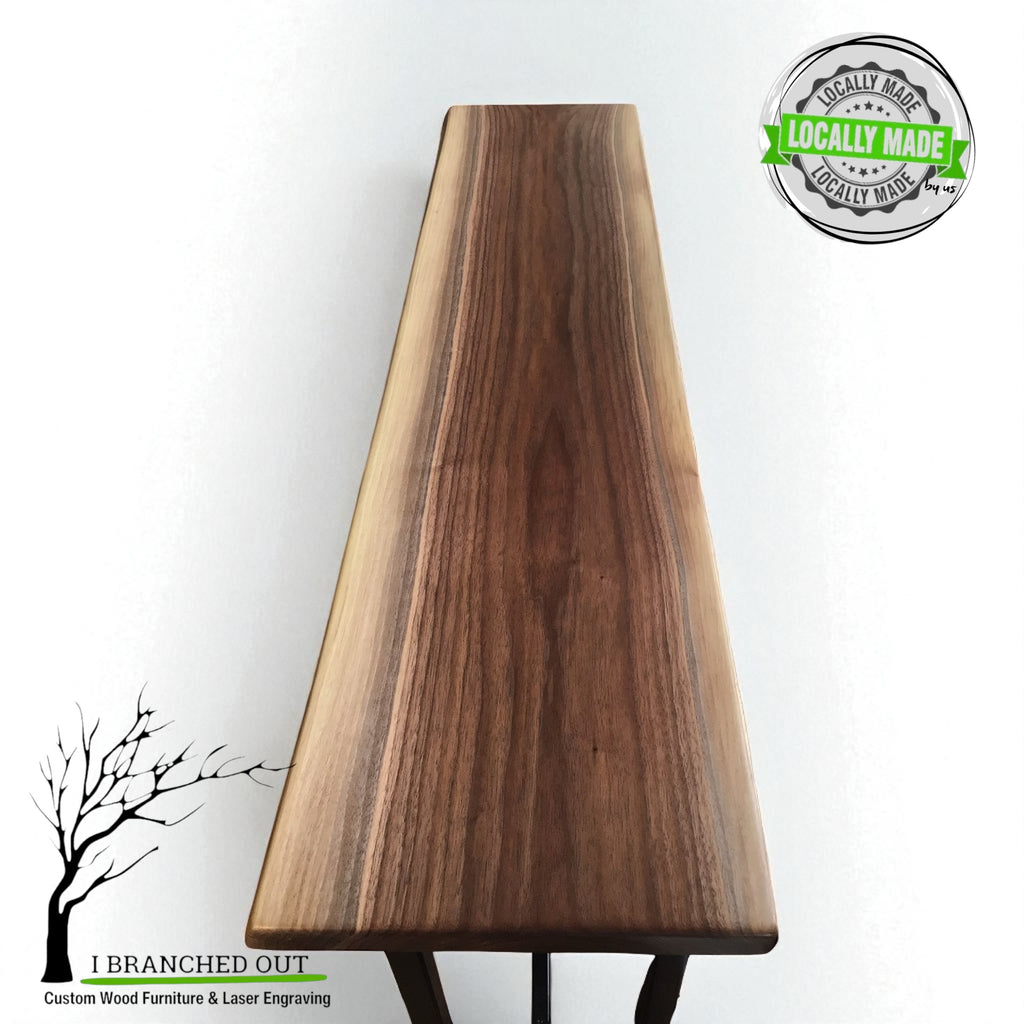 This handcrafted crafted piece is full of character and finished off with a soft live edge! This console table would fit perfectly behind a sofa, in a hallway or, as a little breakfast nook in kitchen! This beautiful walnut console table would be a great addition to any room while adding both beauty and functionality!